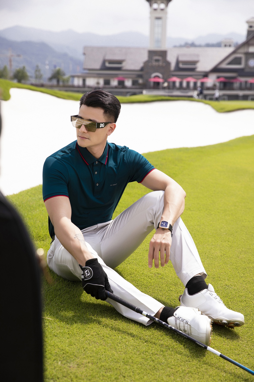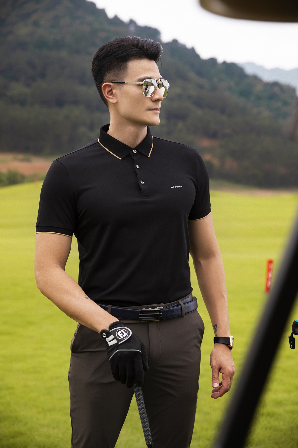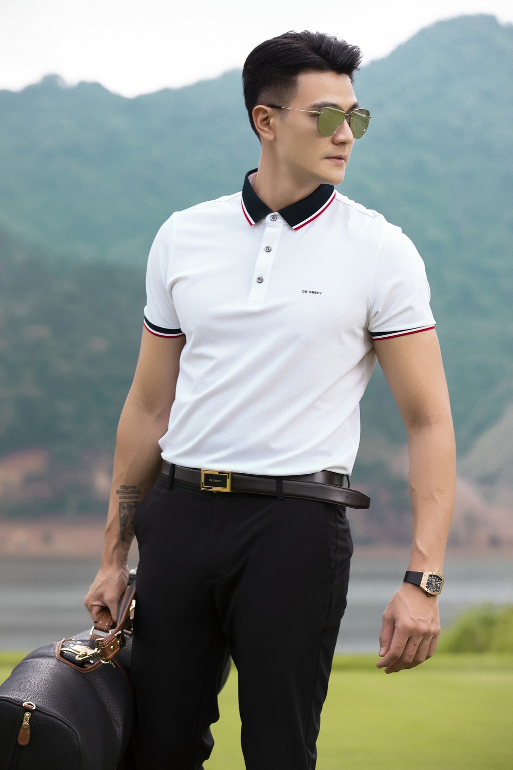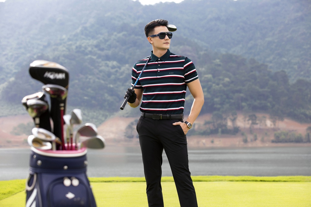 Sở hữu chiều cao 1m85 nên Vĩnh Thụy không cần mặc trang phục cầu kỳ. Nam siêu mẫu vẫn đầy cuốn hút với set đồ tối giản gồm áo polo De Obelly, quần ống đứng, thắt lưng da và kính mắt sành điệu.