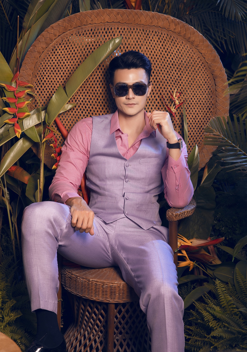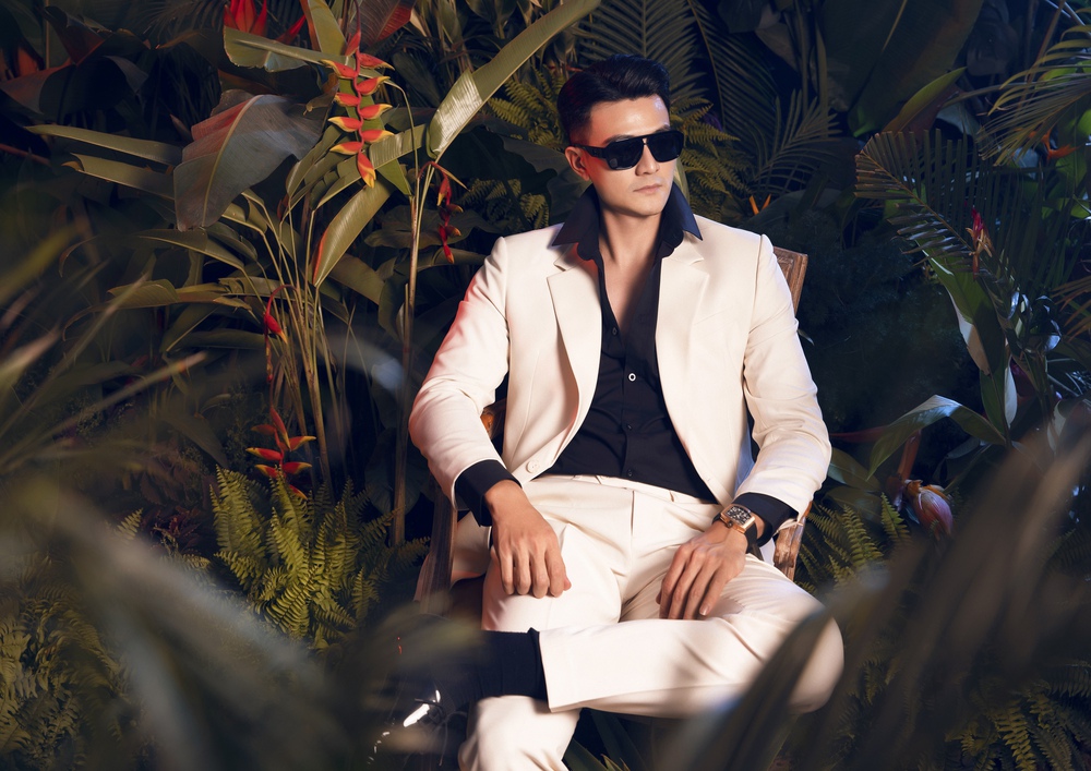 Làm mẫu cho bộ sưu tập mang tên "Tropical Garden", Vĩnh Thụy xuất hiện nổi bật trong những bộ suit đậm tinh thần nhiệt đới.