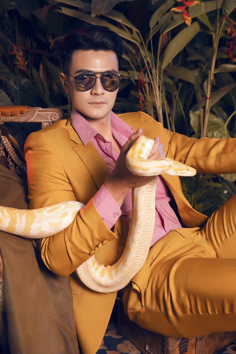 "Bạn diễn" của chàng siêu mẫu là một con trăn kích thước lớn, khiến từng khung hình càng thêm sinh động, ấn tượng. Vĩnh Thụy cho biết anh cảm thấy hoàn toàn thoải mái khi chụp với loài động vật này.